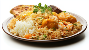 Biryani als würzige Reisbasis, dazu cremiges Butter Chicken und aromatisches Koli Curry. Ergänzt wird das Ganze mit herzhaftem Raal Kulambu und frisch gebackenem Naan – perfekt zum Dippen!
